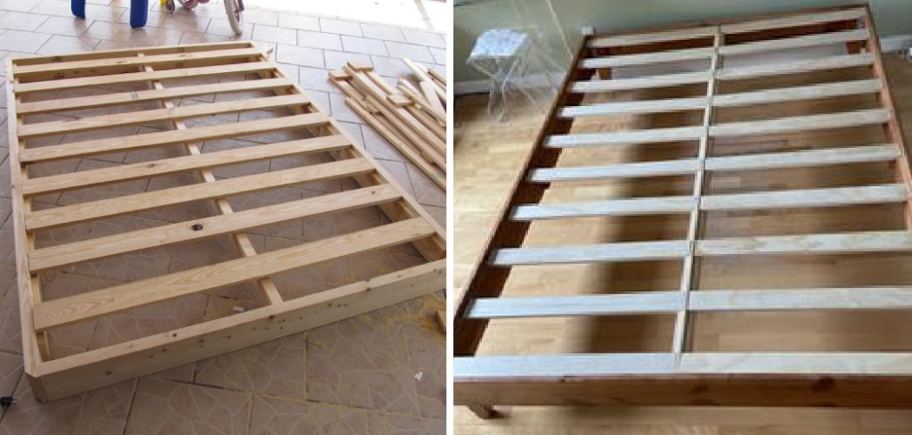Using your remaining pieces of plywood, cut several ½ inch thick slats that are slightly longer than the width of your bed frame. Then attach them to the frame with wood glue and screws, making sure each piece is spaced evenly apart for even support.